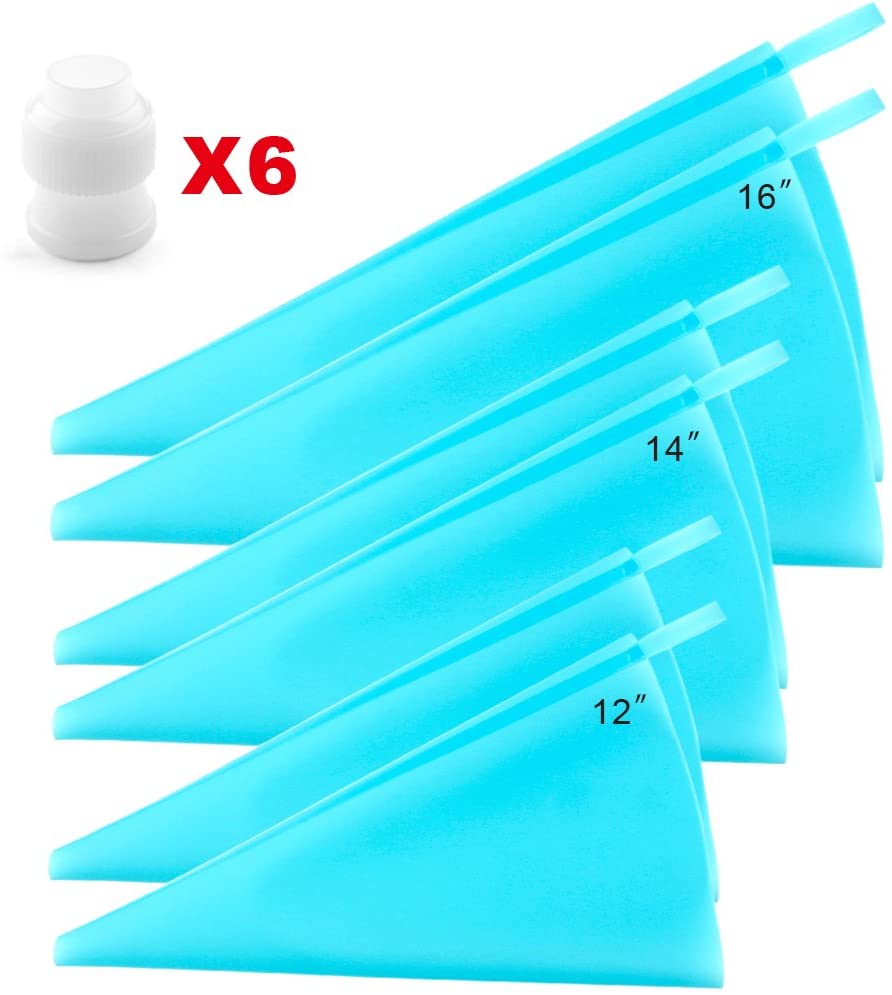 Silicone Pastry Piping Bags (12”+14”+16”)- 6 Pack + 6 Icing Couplers أكياس أنابيب المعجنات المصنوعة من السيليكون (12 بوصة + 14 بوصة + 16 بوصة) – 6 عبوات + 6 وصلات تزيين