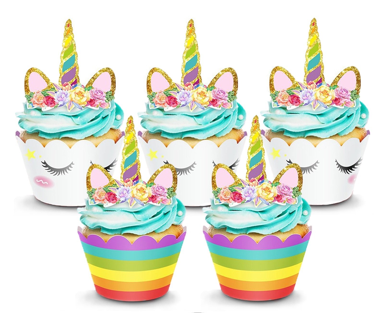 Unicorn Cake Topper & Rainbow Cupcake Wrappers Kit (Set Includes Horn, Ears, Eyelashes)