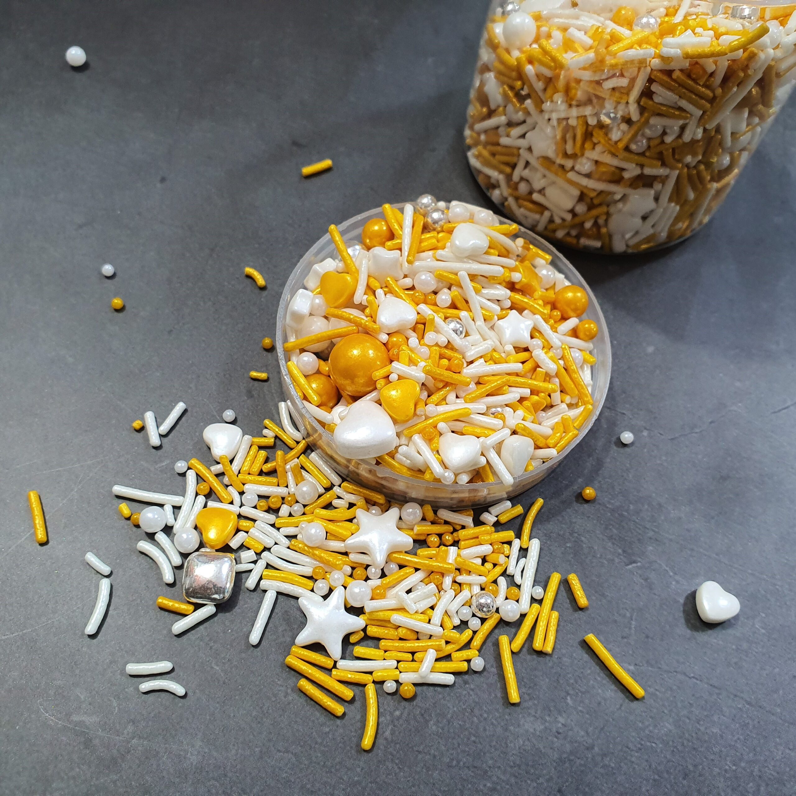Mixed Sugar Sprinkles 50g (White Silver Gold) رشات سكر مشكلة 50 جرام (أبيض فضي ذهبي)